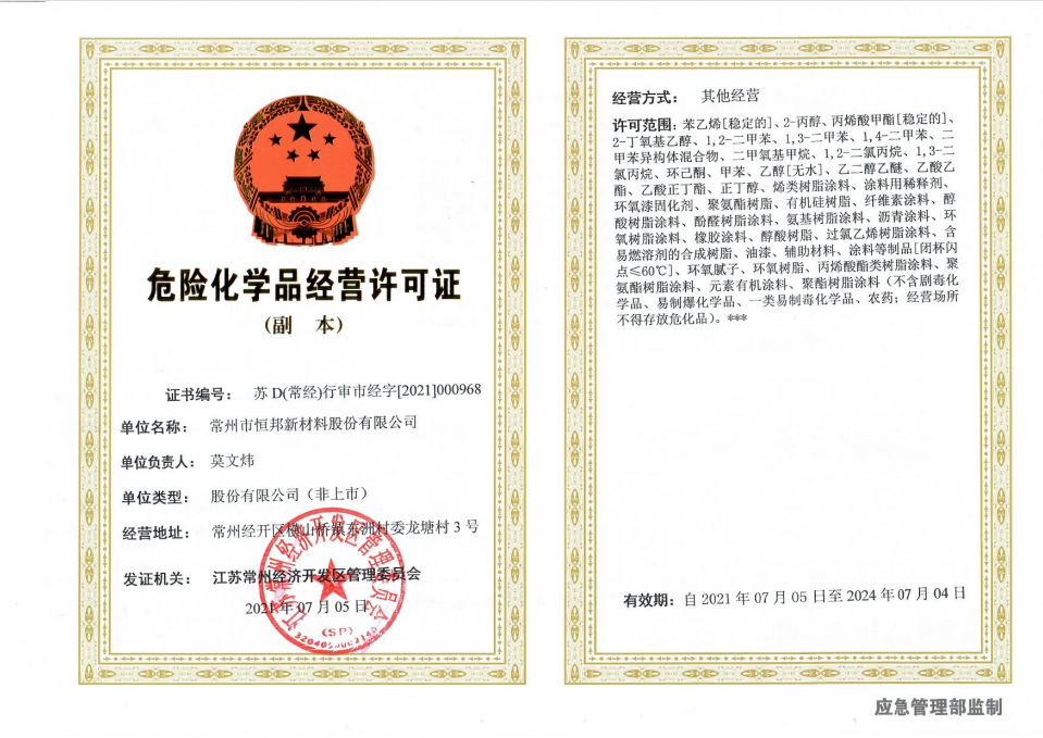 常州市恒邦新材料股份有限公司座落在風(fēng)景優(yōu)美、交通便捷,被國(guó)家列為精細(xì)化工高新工業(yè)園——東洲工業(yè)開(kāi)發(fā)區(qū)。公司擁有面積10000多平方米,是一家集科研、生產(chǎn)、國(guó)內(nèi)外營(yíng)銷為一體的科技型企業(yè)。匯聚一批具有高科技含量的研發(fā)人員和高素質(zhì)的管理人材,及資深實(shí)踐經(jīng)驗(yàn)操作技工。